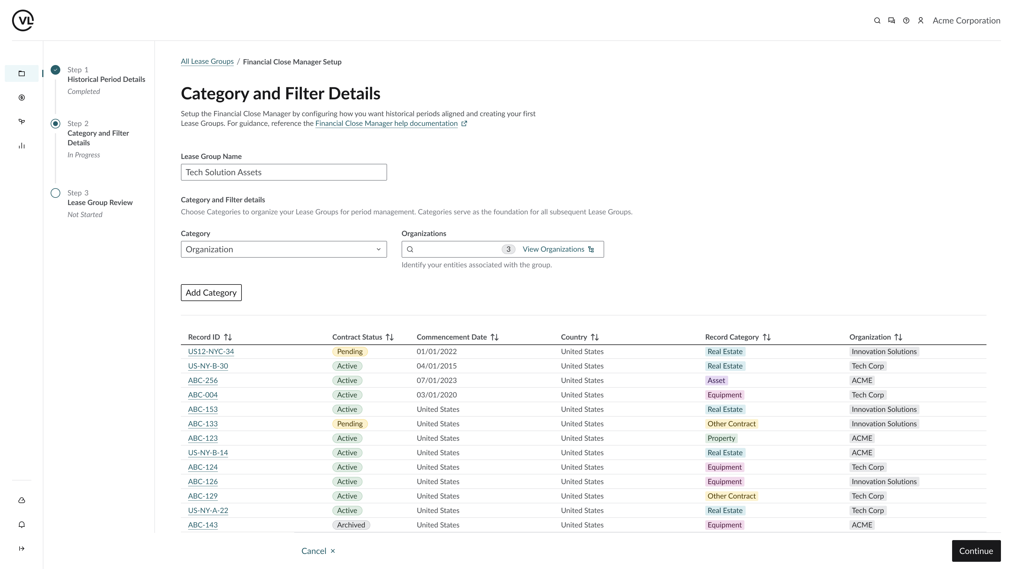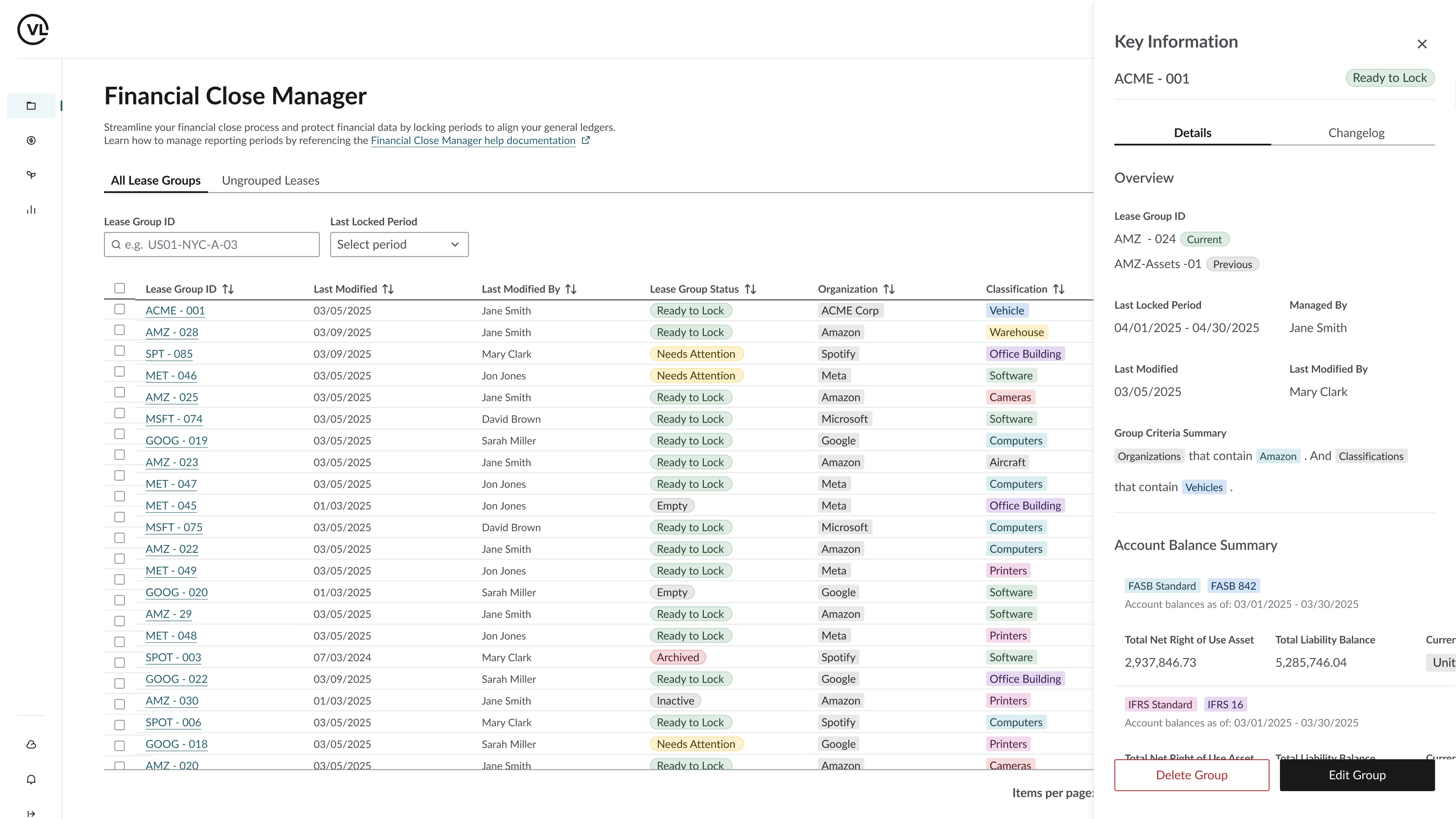 Leases are grouped into customizable sets based on business rules or reporting structure. This enables users to lock and manage periods for specific lease groups without affecting others, supporting more flexible and targeted close workflows.