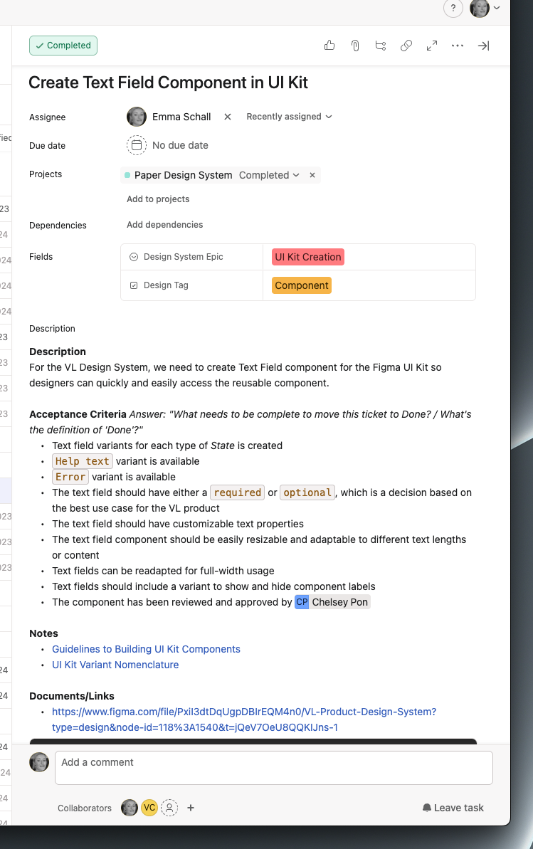 We organized the UI kit build by creating detailed Asana tickets for each component, including clear acceptance criteria. Every component was reviewed, refined, and documented to maintain consistency and quality.