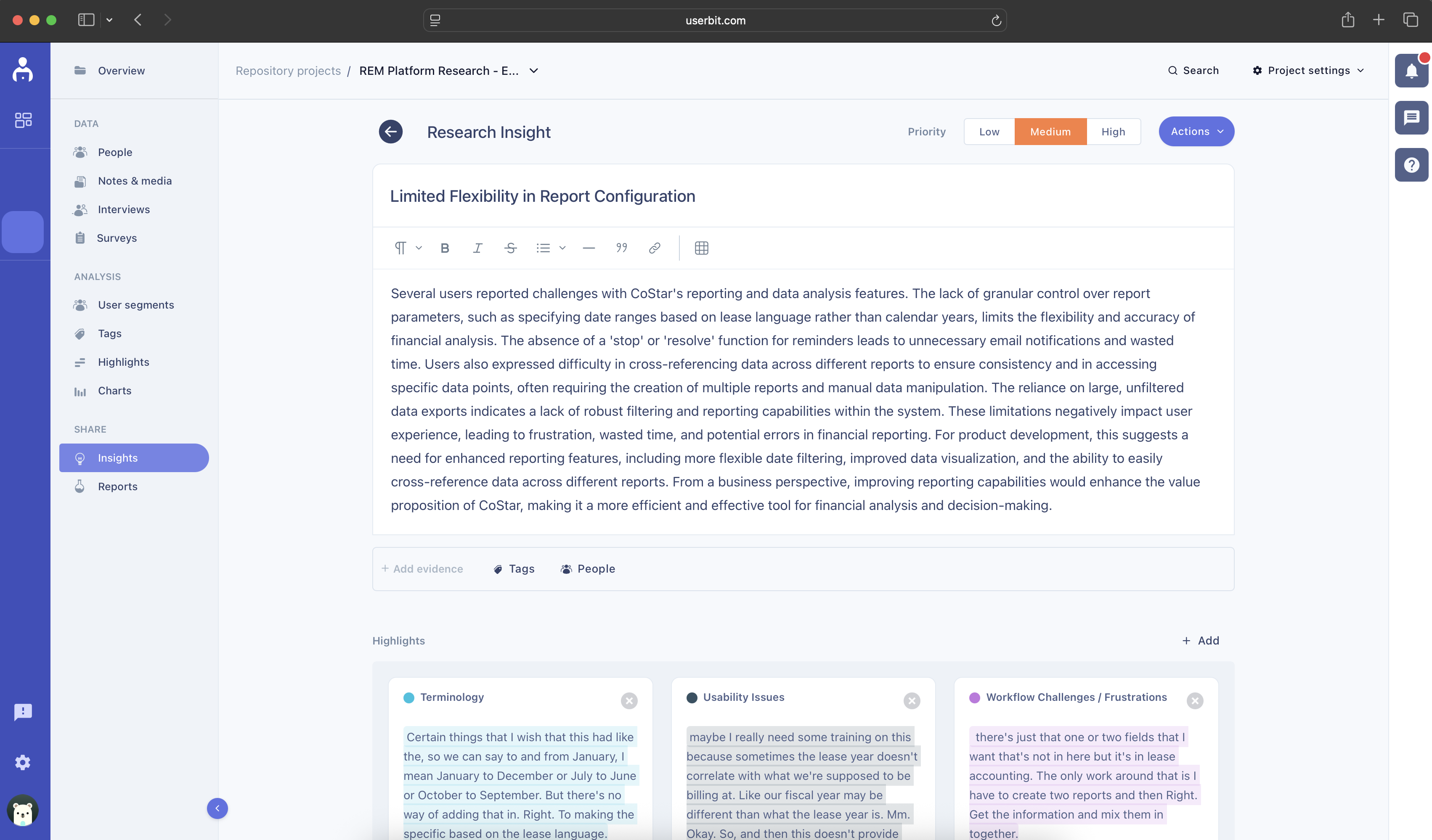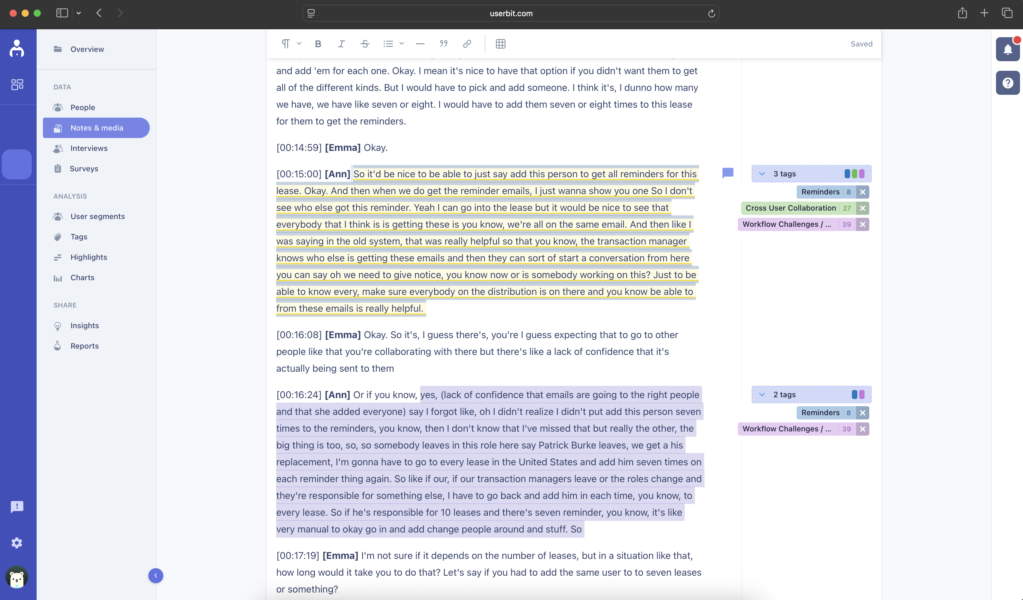 I imported interview recordings into Userbit and reviewed transcripts line by line to tag insights and identify patterns and recurring themes, allowing me to group findings across workflows, features, and user goals. Highlighting representative quotes ensured the insights remained grounded in authentic user experiences.
