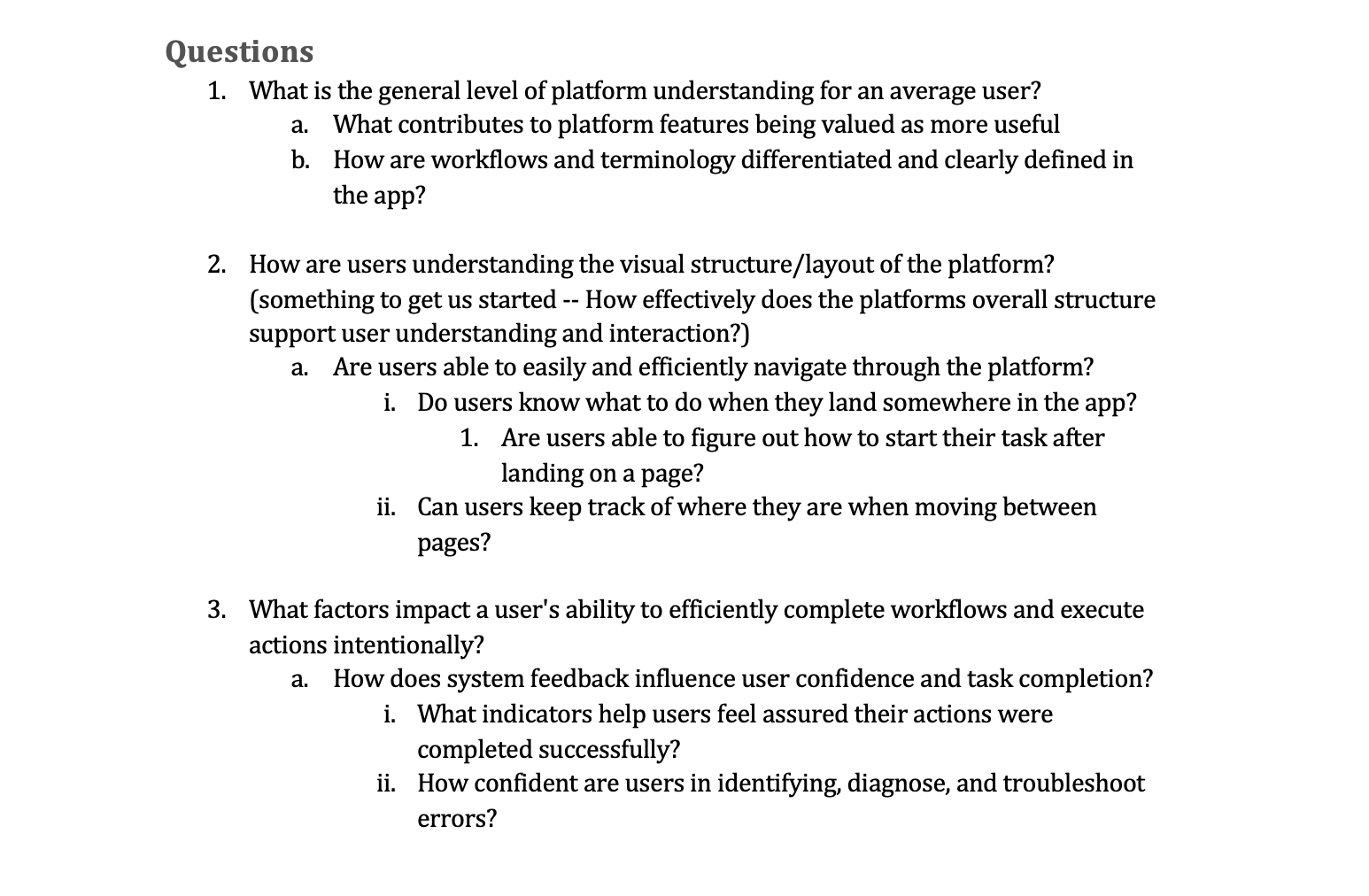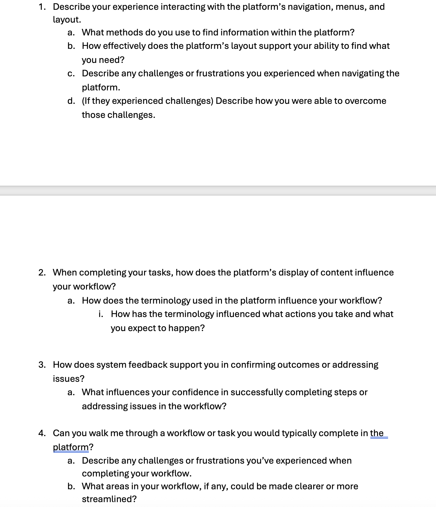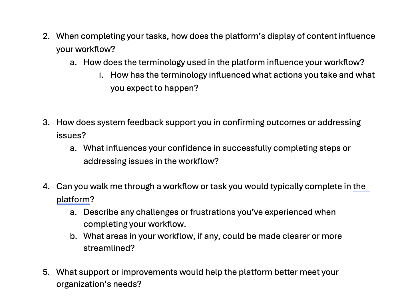 The platform research informed my stakeholder interview questions. I spoke with product leadership, strategy, and customer success teams to understand business goals, constraints, and success metrics, which helped me frame user research findings within the broader business context.